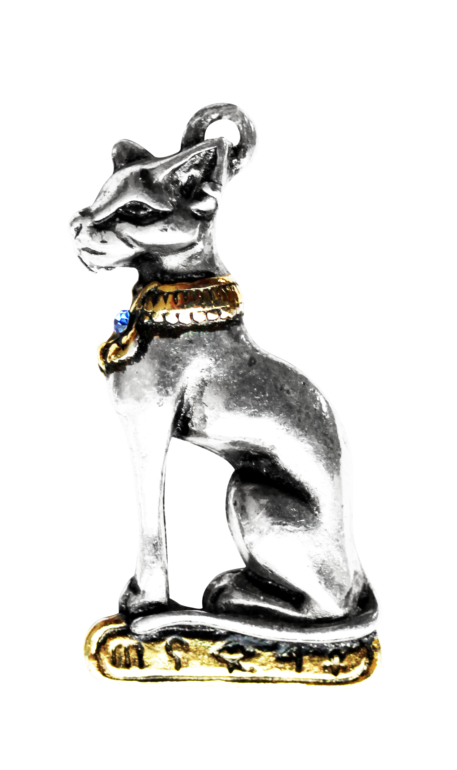 In Ancient Egypt, cat figures were offered to the Sun Goddess, Bast who, as the mistress of music, dance, pleasure and love would offer her blessings. This pendant is finished in silver and gold and is worn for Love & Happiness.