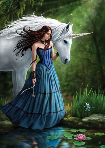 Contemplation is a greetings card featuring artwork by Anne Stokes, with an image of a unicorn with a girl at the edge of a pond. The card is blank to allow it to be used for any occasion.