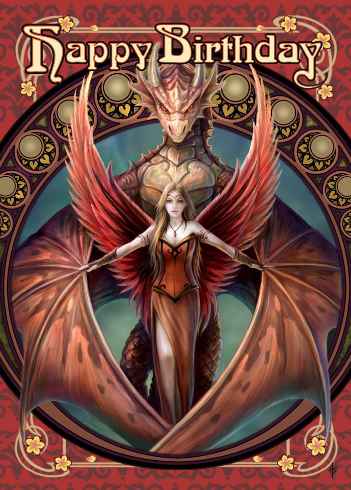 Copperwing is a birthday greetings card featuring artwork by Anne Stokes, with an image of a red gothic angel standing in front of a red dragon and holding its wings.
