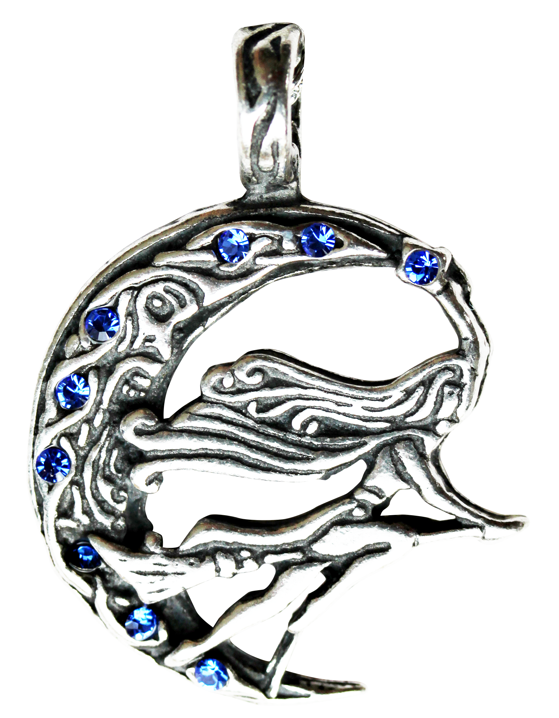 The Norse goddess Freya, known as the fairest of all the goddesses, was revered by the Vikings for love and magic. Set in a crescent moon bejewelled with sparkling blue crystals, the pendant can be worn for love and magic.