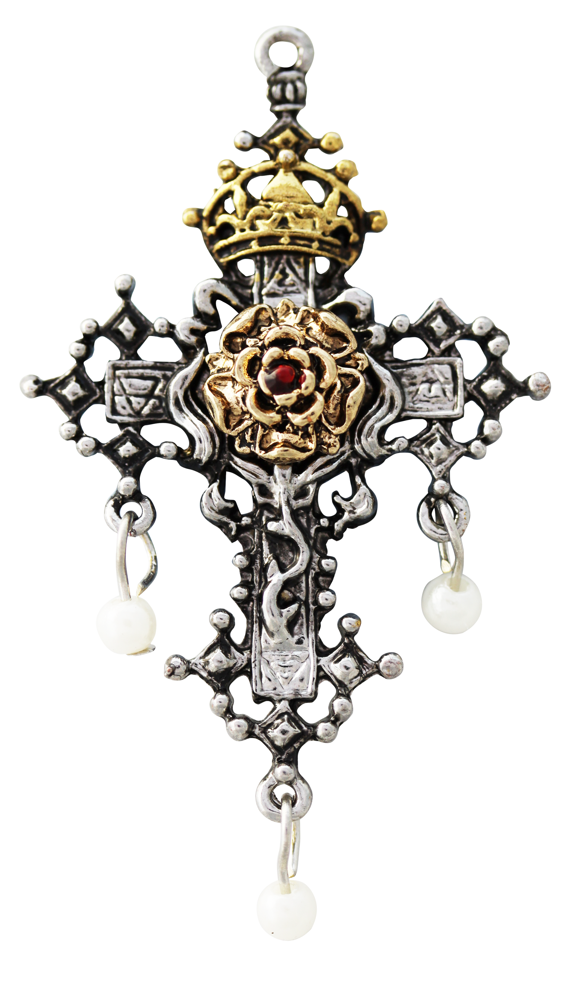 Hampton Court Palace, built in 1514 by Thomas Wolsey, Roman Catholic cardinal, Archbishop of York and Lord Chancellor. Cardinal Wolsey later gave Hampton Court to his monarch, King Henry VIII, remembered for his six wives, establishment of the Church of England, and father to Elizabeth I, the last Tudor royal. The Tudor Rose and Crown adorns the mediaeval cross to create a symbol of singular beauty, signifying faith and devotion.
