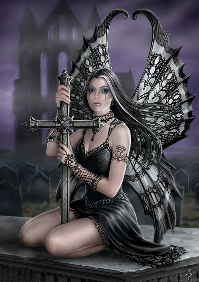 Lost Love is a greetings card featuring artwork by Anne Stokes, featuring an image of a gothic fairy in a crypt kneeling down while holding her black crucifix. The card is blank to allow it to be used for any occasion.
