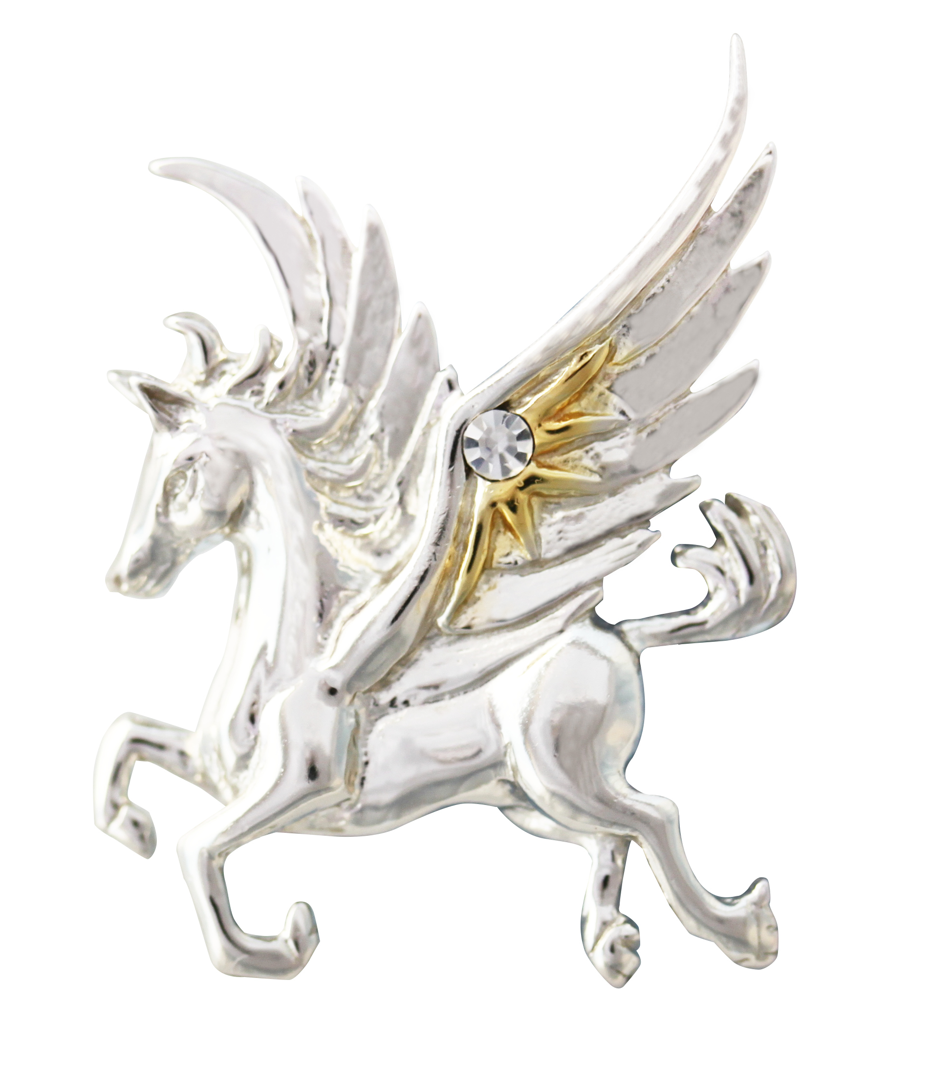 Fleet of foot and swift of wing, the celebrated mythic horse grants originality and imagination to those who wear his image. Here, in full flight, with a star mirrored twinkling on his wing, Pegasus heralds artistic inspiration from the Muses.