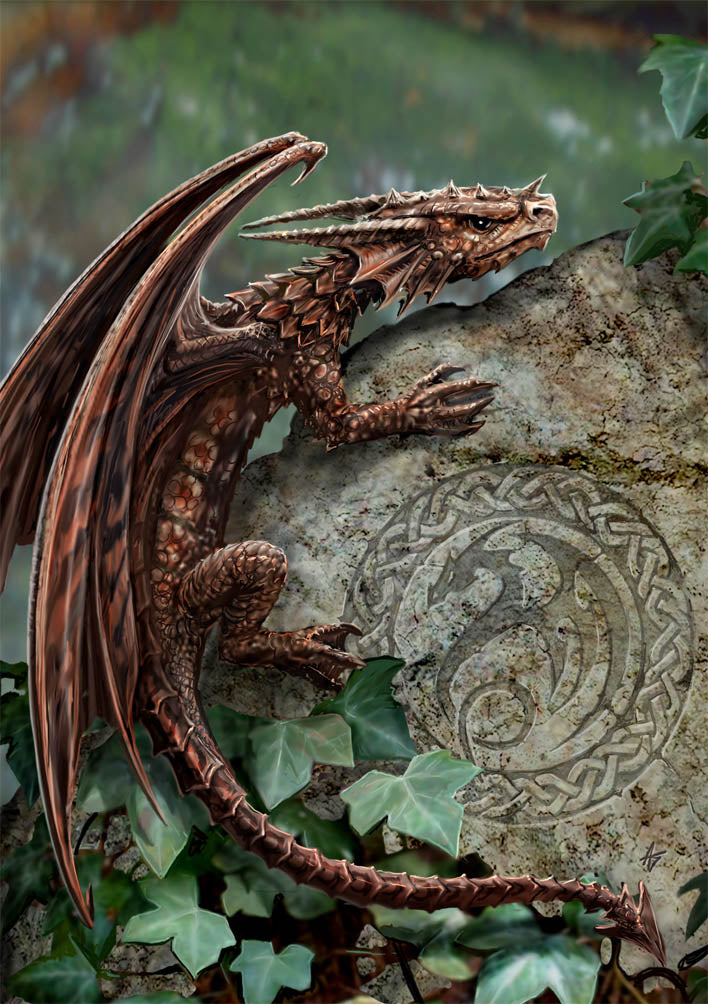 Spiny Woodland Hopper is a greetings card featuring artwork by Anne Stokes, with an image of a brown dragon climing an ivy covered rock. The card is blank to allow it to be used for any occasion.