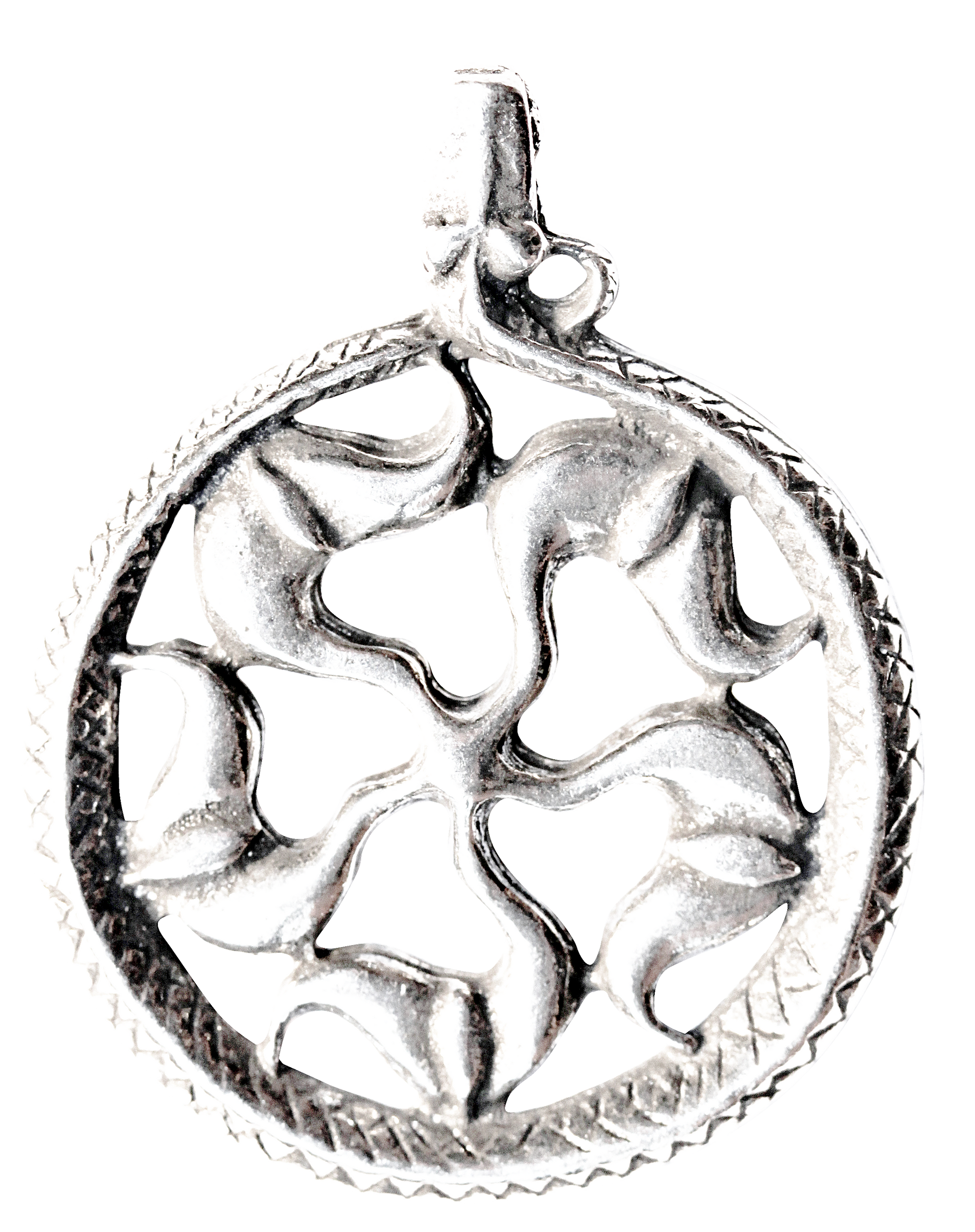 The Midgard serpent, Jormungandr, encircles the Sun Wheel, one of the oldest and most sacred of man's symbols. Sun Wheels feature on rock carvings and jewellery throughout the Norse world, marking the importance of the sun in agriculture and its traditional link with the precious metal gold.